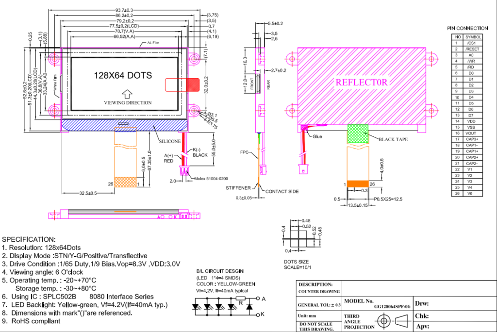Backlight : Side type, Yellow-Green color(Vf=4.2V)