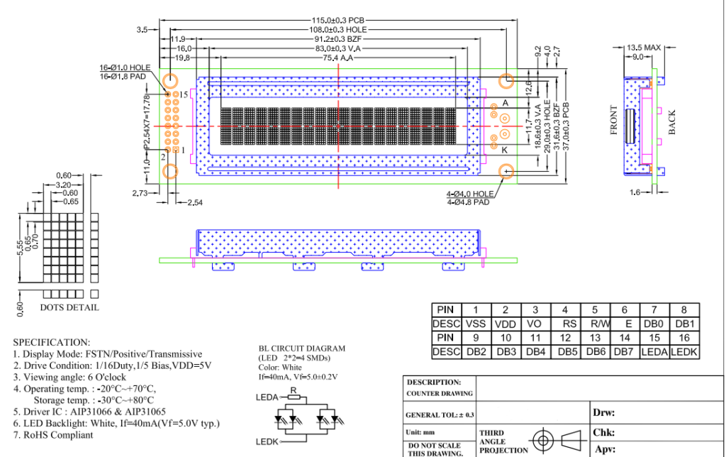 Driving Method: 1/16 Duty; 1/5 Bias VDD:5V